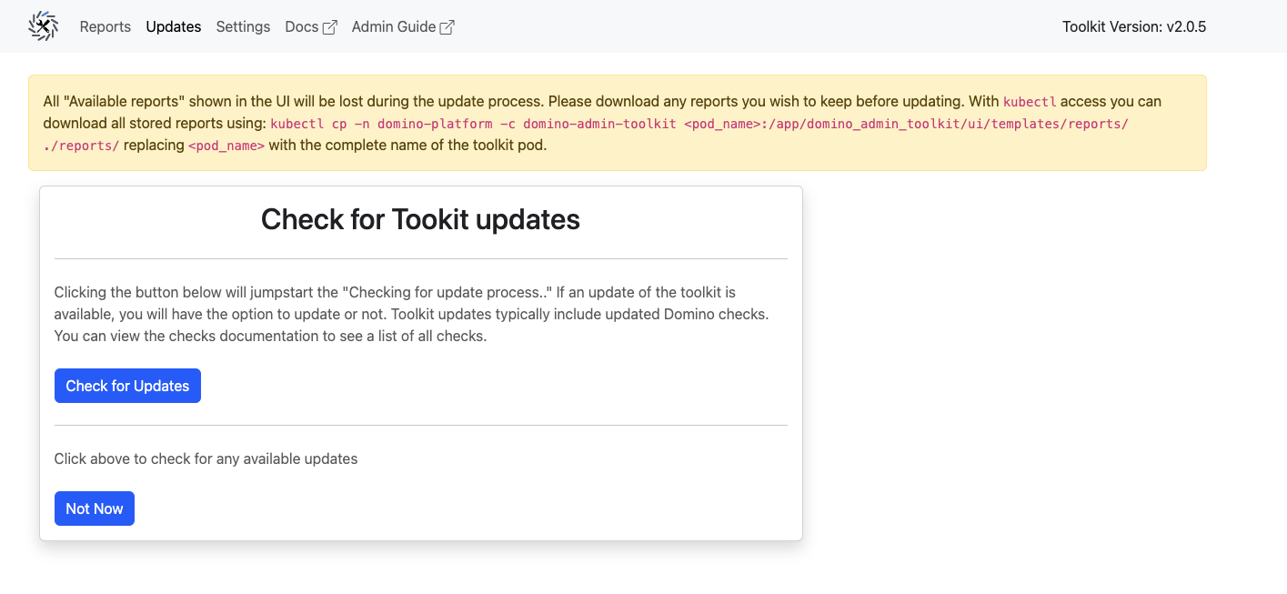 The toolkit can be updated independently of the Domino version deployed. In the toolkit web interface, click on the Updates tab and then on the Check for updates button to check for a new toolkit Docker image.